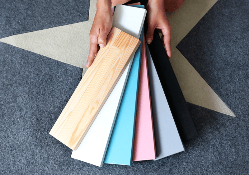 Das Bett ist in vier Farben erhältlich: weiß, rosa, grau und mint (RAL 7004, RAL 6034, RAL 3015).