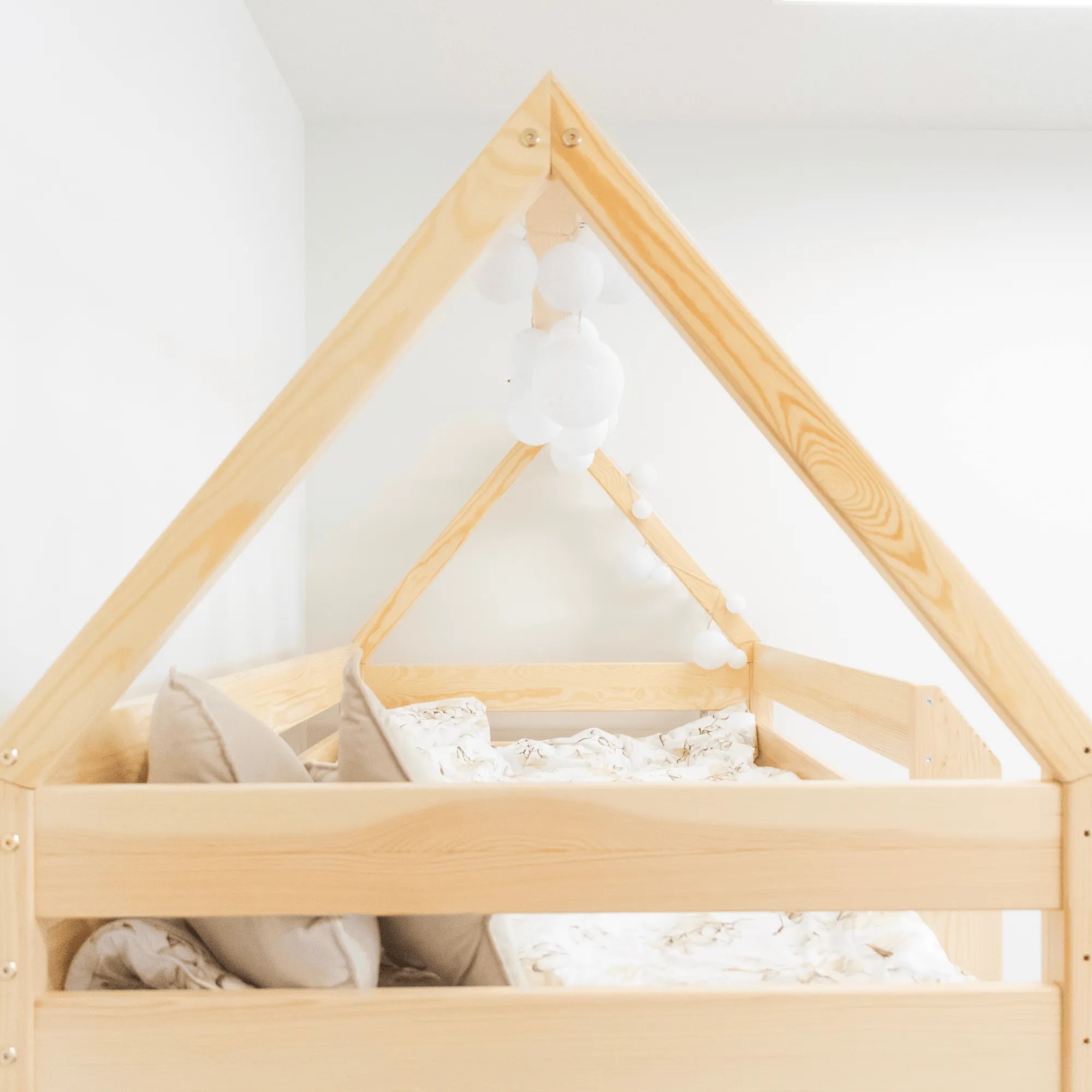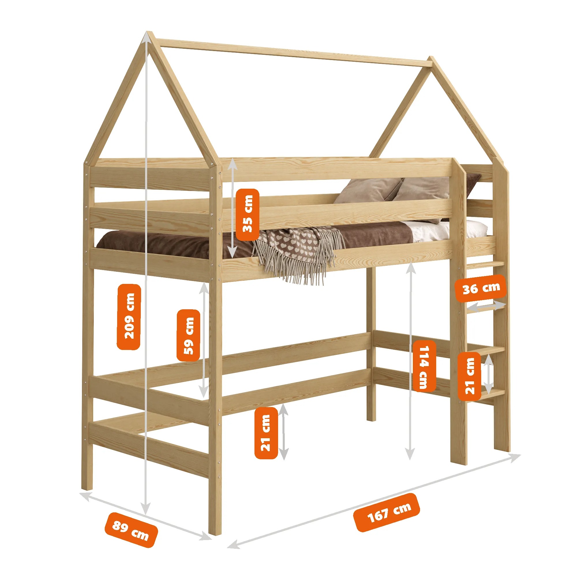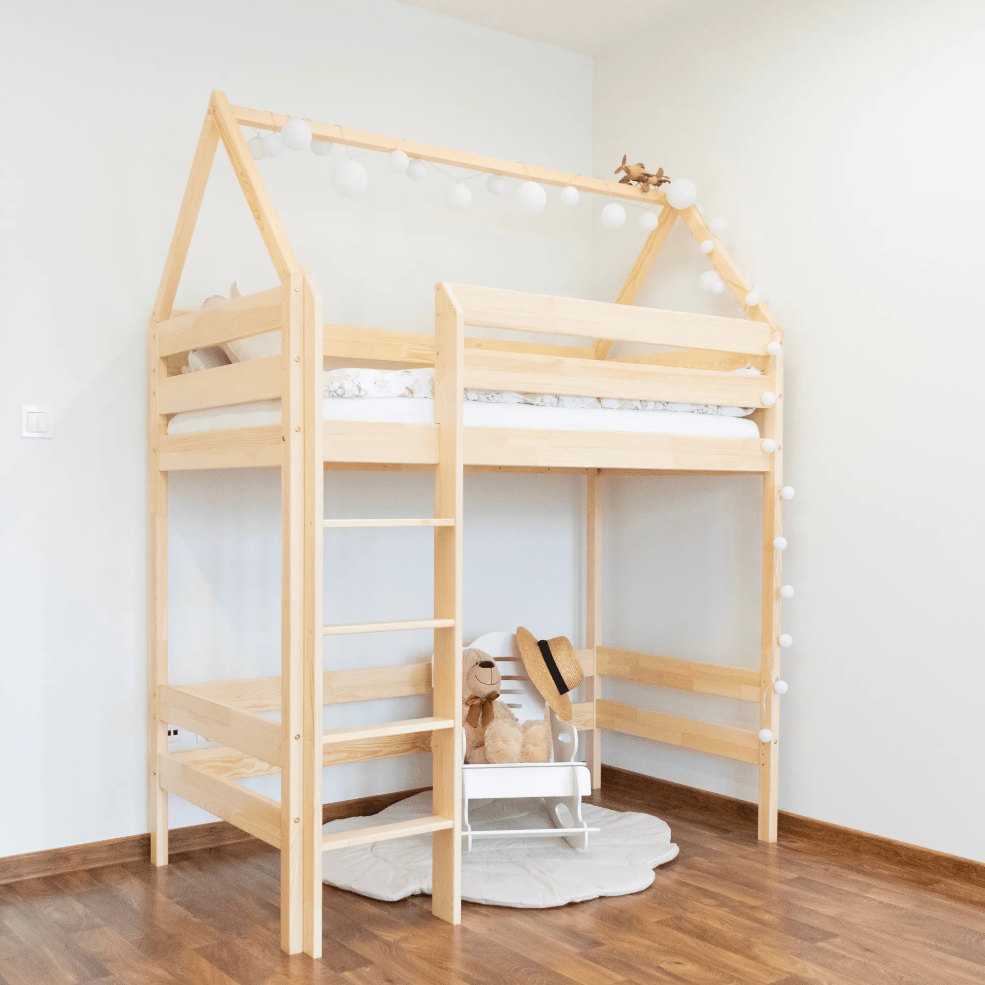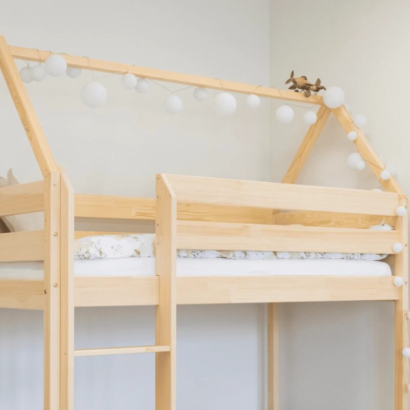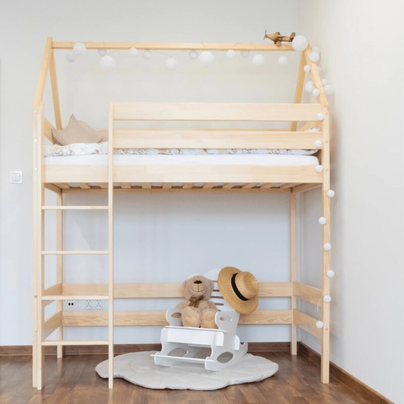 Højseng Alme er det ideelle valg til dig, der ønsker en stilren, holdbar og sikker løsning, som ikke kun udnytter rummet effektivt, men også tilføjer et unikt og æstetisk udtryk til børneværelset.