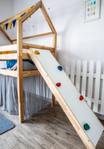 Den höga sängen har en höjd på 70 cm, vilket gör den både praktisk och enkel att använda i olika rum. Den medföljande klätterväggen är 150 cm lång och sträcker sig 120 cm in i rummet, vilket skapar en rolig och utmanande lekplats för barnet.